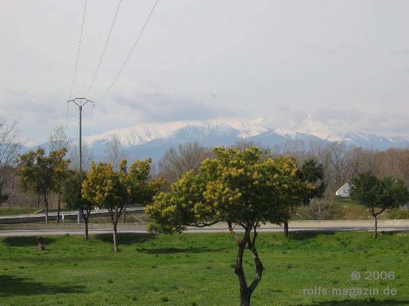 Ein schöner Kontrast: blühende Mimosen vor dem schneebedeckten Canigou